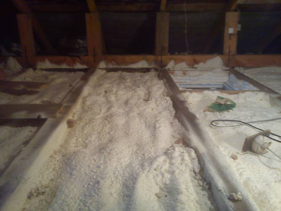 Жидкий пенополиуретан ― на сегодняшний день лучший для частного дома способ утепления холодного потолка изнутри. Вспененная пластмасса, затвердевая, сохраняет в структуре закрытые пузырьки с углекислым газом и открытые каверны, образующие капилляры для отвода жидкости.