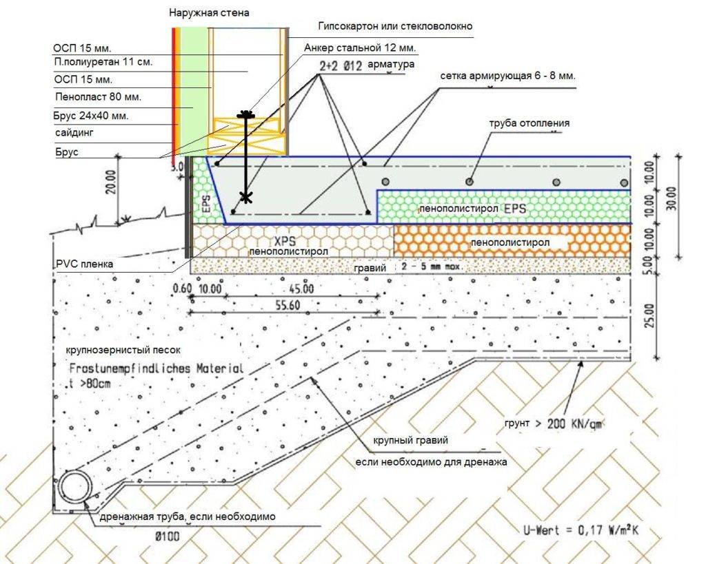 - Материалы: песок, гравий, геотекстиль, трубы для дренажа, бетон, экструдированный пенополистирол, доски для поддержки опалубки, система теплого пола.