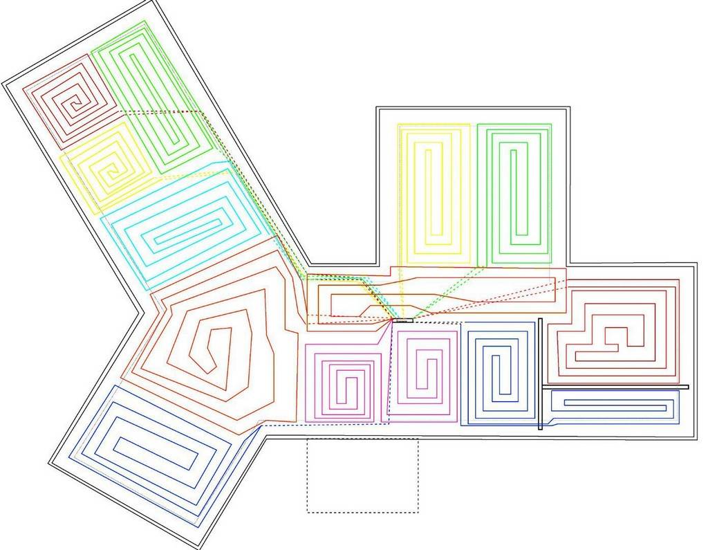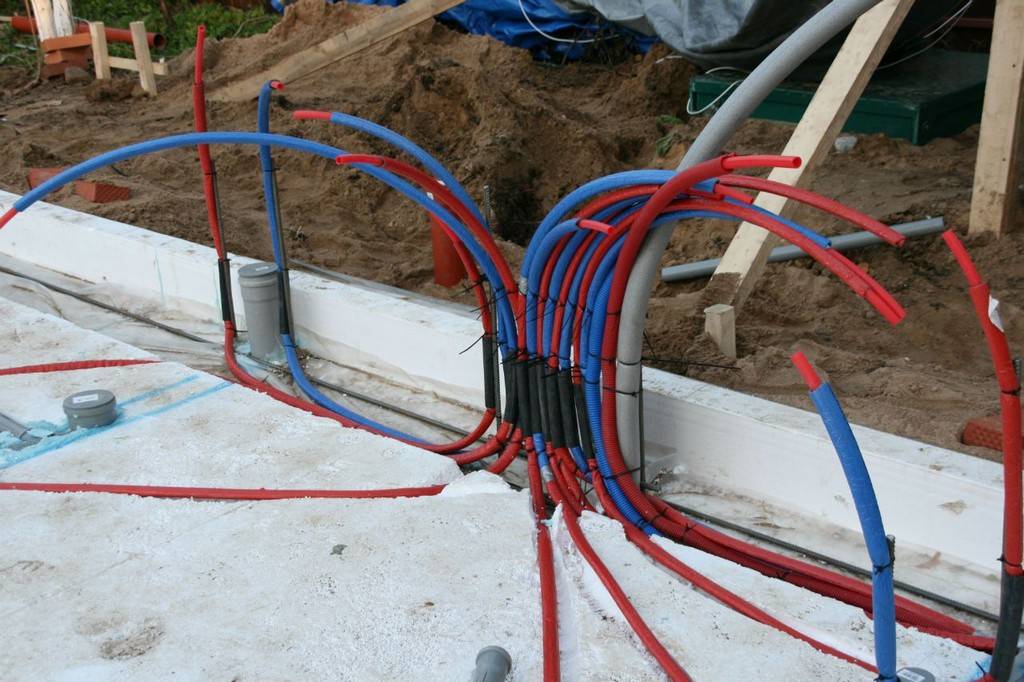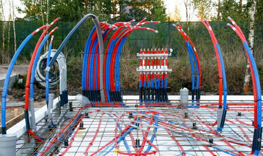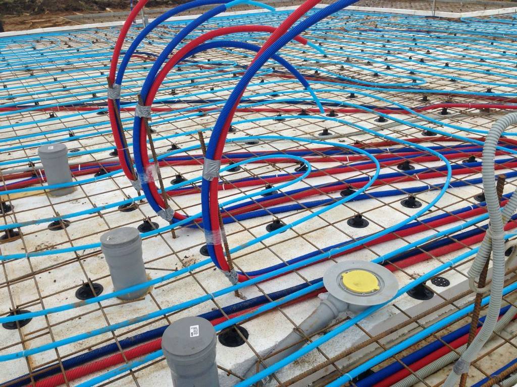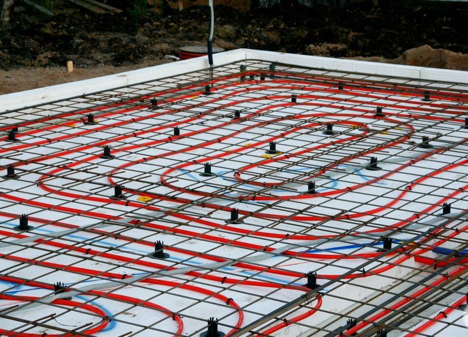 После армирования укладываются трубы теплого пола. Трубы фиксируются к арматуре и прокладываются по плану.
