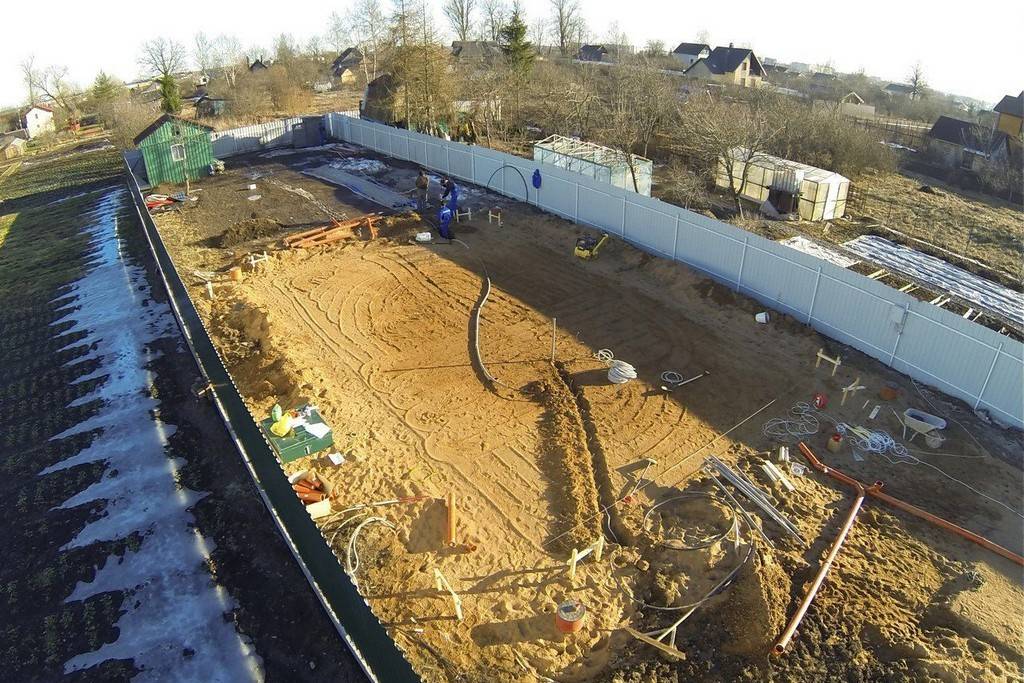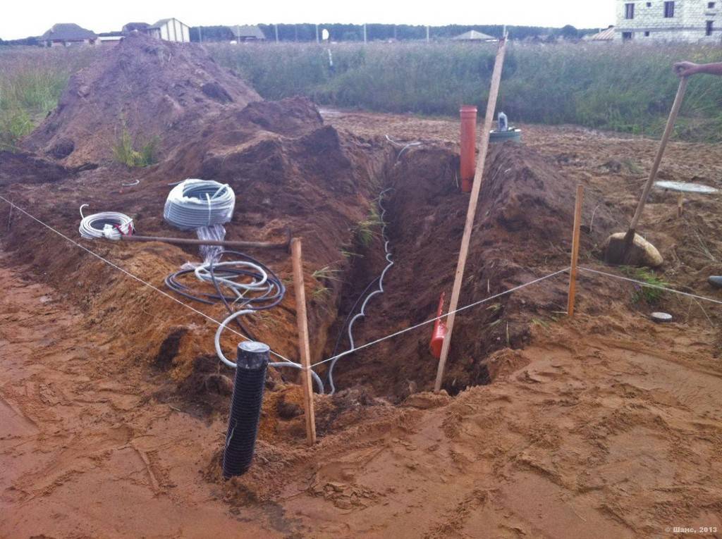 Для коммуникаций, в песке роются траншеи. Песчаной подушкой в траншеях создается нужный уклон. В траншеи укладываются трубы коммуникаций, бронированные кабели электропитания, пластиковые трубы электропроводки и шины заземления.
