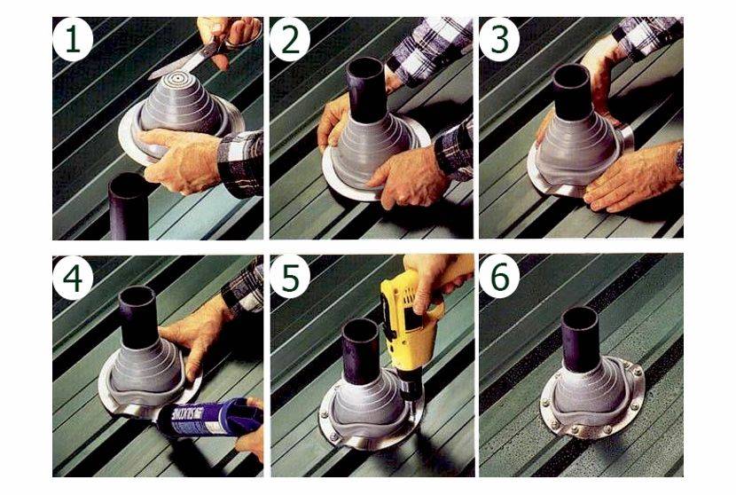 Эластичные проходы через кровлю для вентиляции устанавливаются путем натягивания уплотнителя на трубу – для облегчения работ можно использовать мыльный раствор. Затем края прижимаются специальным фланцем, который впоследствии обминается по форме покрытия для плотного прилегания. На следующем этапе проходной элемент уплотняется – для этого под фланец наносится герметик. После этого производится крепление проходки специальными саморезами.