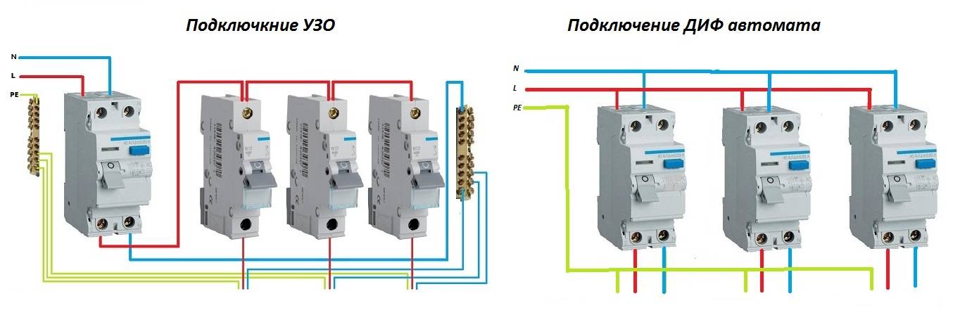 Сравнительная схема установки и подключения защитной пары и дифавтомата. Результат срабатывания в аварийной ситуации и надежность устройств одинаковая, а порядок присоединения проводов отличается