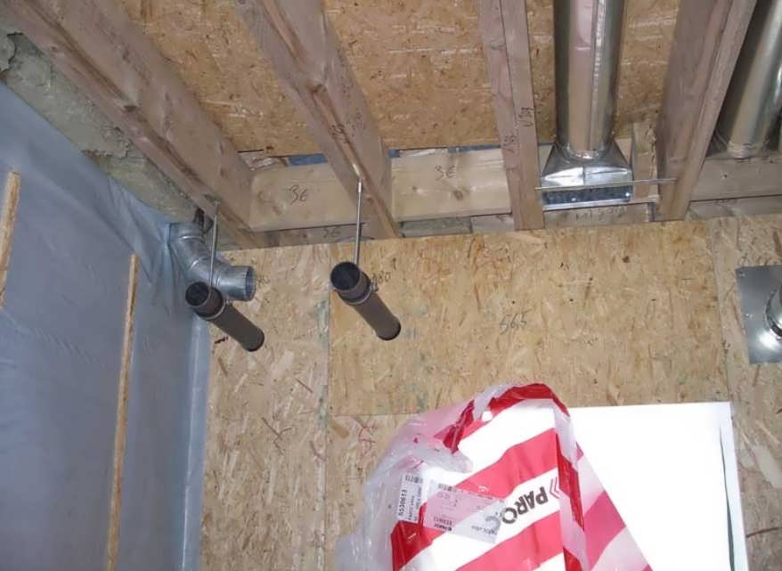 Встраивая каналы в каркас, можно использовать асбестоцемент или пластик, диаметром не более 10 см. Металлические трубы не применяют – в стенах они могут промерзать.