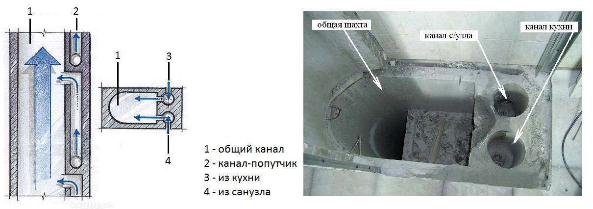 Рядом с общей шахтой расположены индивидуальные вентиляционные каналы кухни и санузла. На уровне каждого этажа они имеют выход в общую шахту и перекрыты заглушками