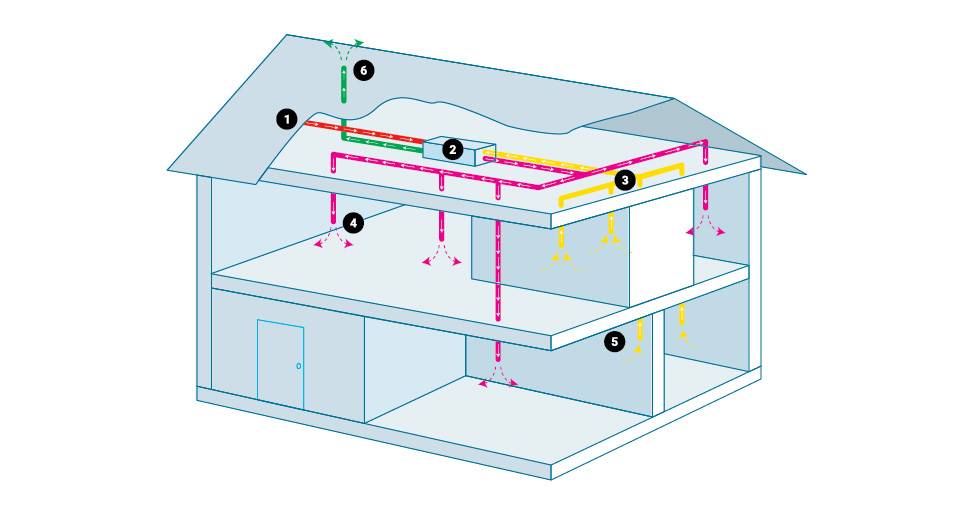 - Очищенный, доведенный до комфортной температуры воздух подается в жилые помещения.