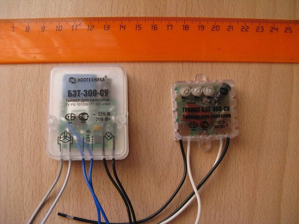 Наиболее распространенный вид таймеров подключается к сети 220 В и имеет вход сигнального провода от лампы освещения. Другими словами, таймер всегда подключен к питанию, а уже к нему подключается вентилятор. При включении света в ванной комнате к таймеру поступает сигнал и начинается отсчет времени, по истечении которого включается вытяжка. При выключении света питание на сигнальном проводе пропадает и начинается обратный отсчет времени – до отключения.