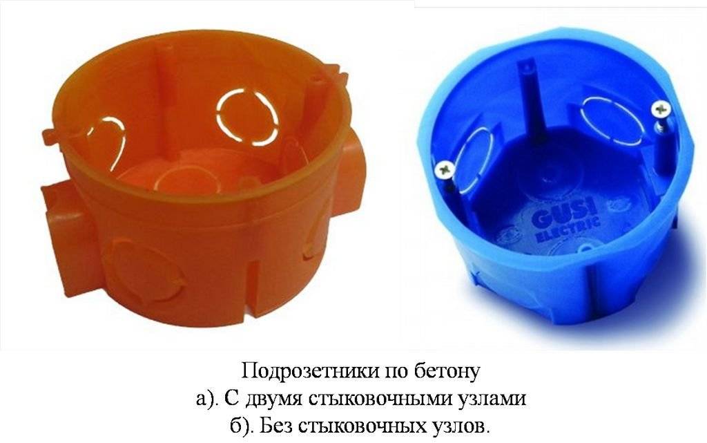 Подрозетники бывают пластиковыми или металлическими. Для установки коробки обычно используют первый вариант, имеющий большой ассортимент моделей и форм: