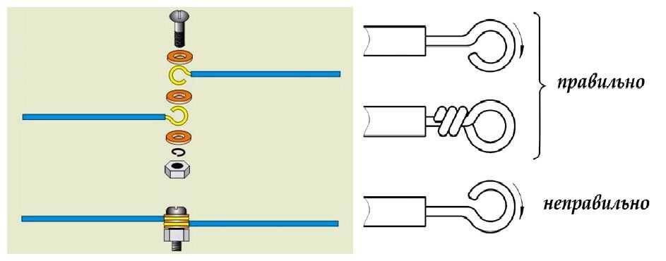 Сначала проводники зачищаются от изоляции, при необходимости снимается верхний окисленный слой. Далее из зачищенной части формируется петля, внутренний диаметр которой равен диаметру болта. Чтобы было проще — можно провод обернуть вокруг болта и закрутить (средний вариант на правом рисунке). После все это собирается в таком порядке: