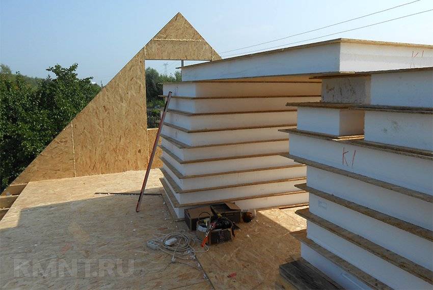 В простейшем случае панели накрывают венцом из доски, положенной плашмя на верхний открытый торец стен. Сверху устанавливается на ребро вторая такая же доска, притянутая саморезами снизу к венцу. Подобный Г-образный элемент проще сбивать на земле, а затем устанавливать в сборе. Его крепят к закладным брусьям внутри панелей и к стойкам каркаса. Внутренние несущие перегородки накрываются одной доской без вертикального ребра.