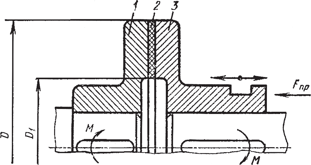В этих муфтах имеются две группы дисков: внутренние 2 и наружные 3. Наружные диски с D1 соединены с полумуфтой 1, а внутренние c D – с полумуфтой 5 посредством подвижного шлицевого соединения. Правый крайний внутренний диск опирается на регулировочные гайки 4; на левый крайний диск действуют силы нажатия от механизма управления. При этом сила нажатия будет передаваться на все поверхности трения.