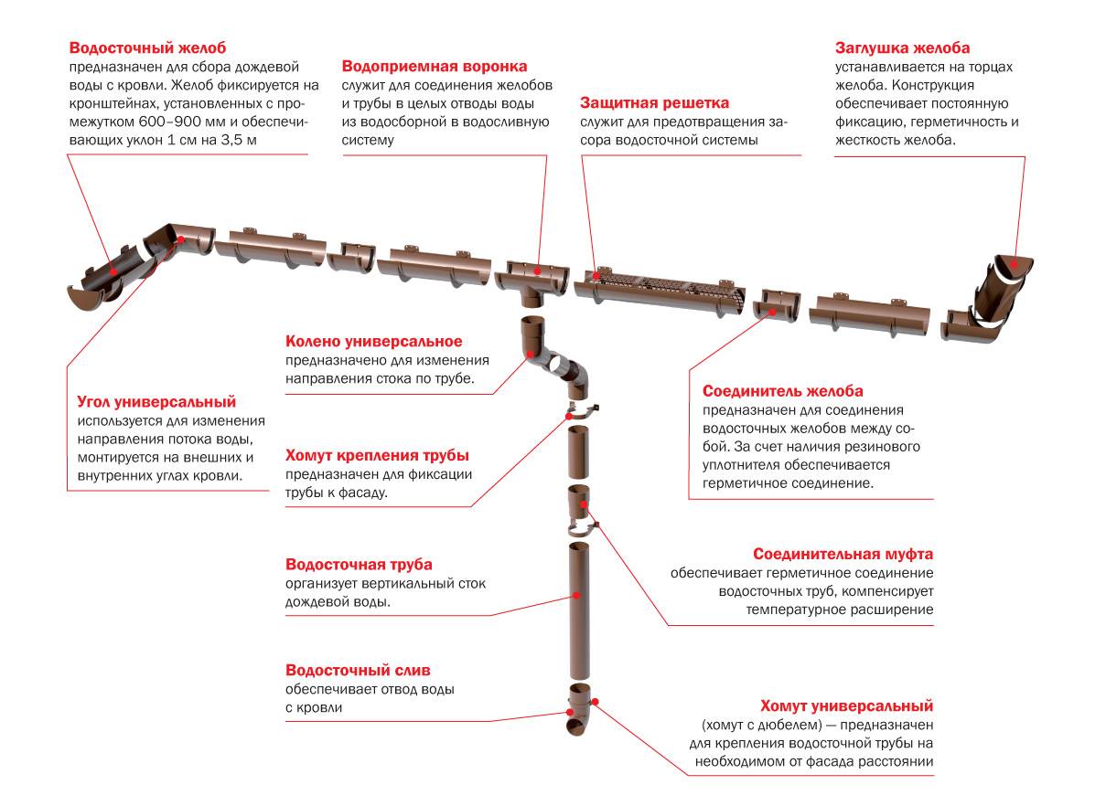 Независимо от категории водосточной системы, она включает одинаковый набор составляющих элементов: водосточные трубы, стоки, воронки, желоба, углы, кронштейны и хомуты.