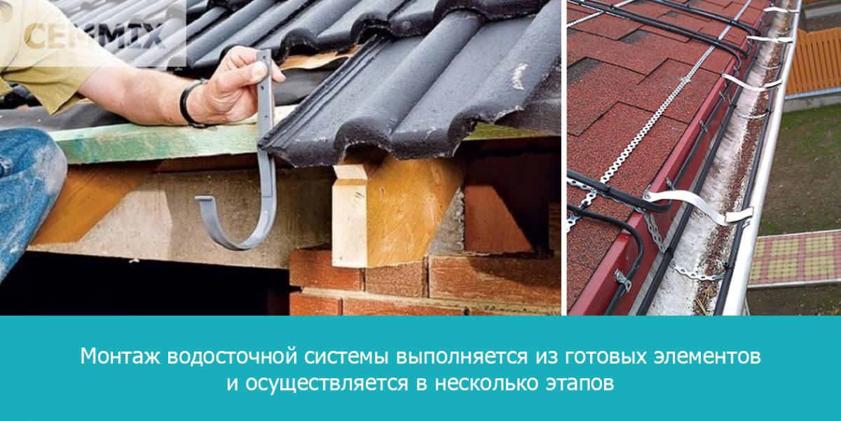Монтаж водосточной системы выполняется из готовых элементов и осуществляется в несколько этапов: