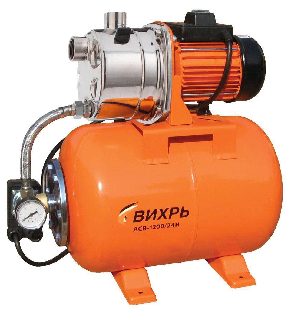 Небольшая насосная станция предназначена для подачи чистой воды. Она имеет небольшой накопительный бачок на 24 л, чего вполне хватит для регулярного пользования семьей из 3 человек. В данной модели нет эжектора, поэтому максимальная глубина забора воды из скважины составляет 8 м. За час она способна перекачивать 3200 л — это одновременная работа стиральной машины, туалета, душевой кабинки и пары умывальников (естественно всё сразу использоваться будет редко).