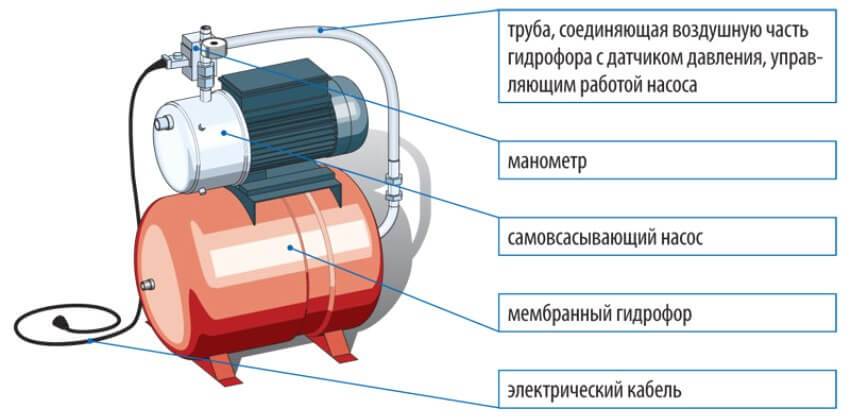 Основой насосной станции является насос любой системы, но чаще всего центробежного типа. Его работой управляют датчики давления и оснащенный эластичной мембраной гидроаккумулятор, реагирующий на изменение объема воды (+)