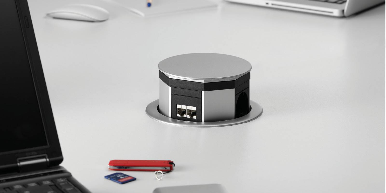 Существует еще одно решение для организации телекоммуникационных и сетевых установок — это выдвижные розетки в столешницу. На столе видны только провода устройства, а вся проводка скрыта. Монтаж такого блока не является сложным. Просверлите отверстие в столе ближе всего к месту, где будет подключено оборудование. Затем в отверстие вставляется часть обложки колонки, только после этого будет вставлен столбик, в котором есть соединения с Интернетом, электричеством, телефоном. Такой столбик подходит не только для конференц-столов, но и для других рабочих мест.