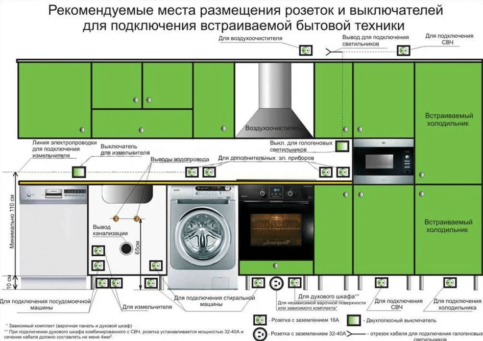А также выделяют ряд советов по расположению точек подключения к электросети для различных кухонных приборов и бытовой техники: