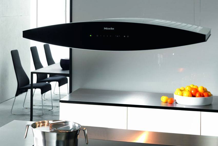 - Островными – располагаются в центре комнаты над островом, крепится к потолку и соединяется с вертикальной вентиляционной трубой. Используется в просторных кухнях или студиях с островом. Нередко островная модель выступает не только функциональным предметом интерьера, но и дизайнерской «изюминкой».