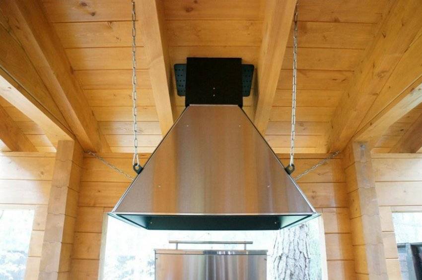 Установка вытяжки над мангалом производится либо на стойках, либо на подвесах. Стойки могут быть железными или кирпичными. Подвесы используются главным образом при монтаже островных вытяжек. Главное требование к подвесу – надёжность. Для повышения декоративности нередко используются толстые железные цепи.