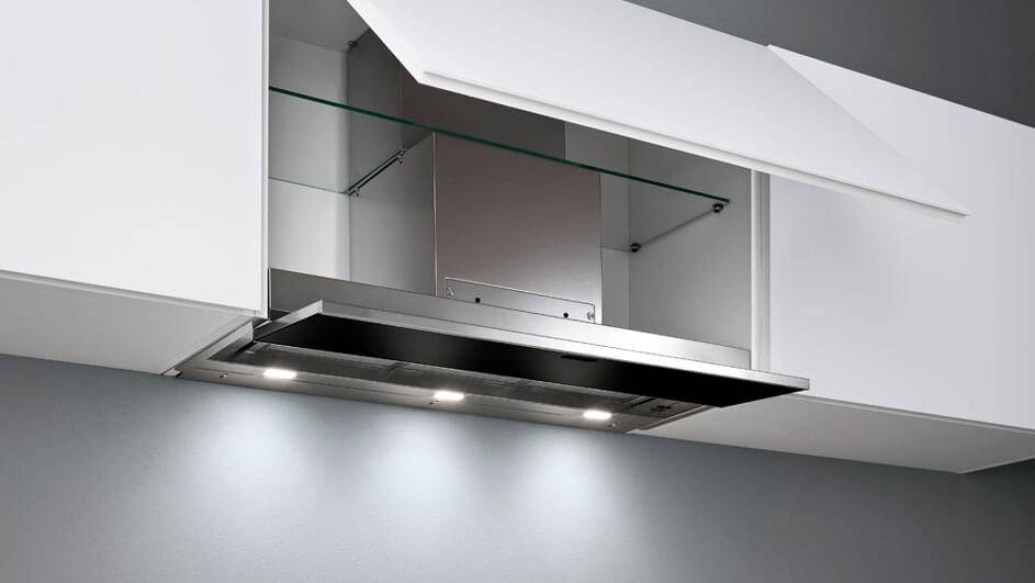 - встраиваемая, монтируется в шкаф над варочной поверхностью и практически не видна;