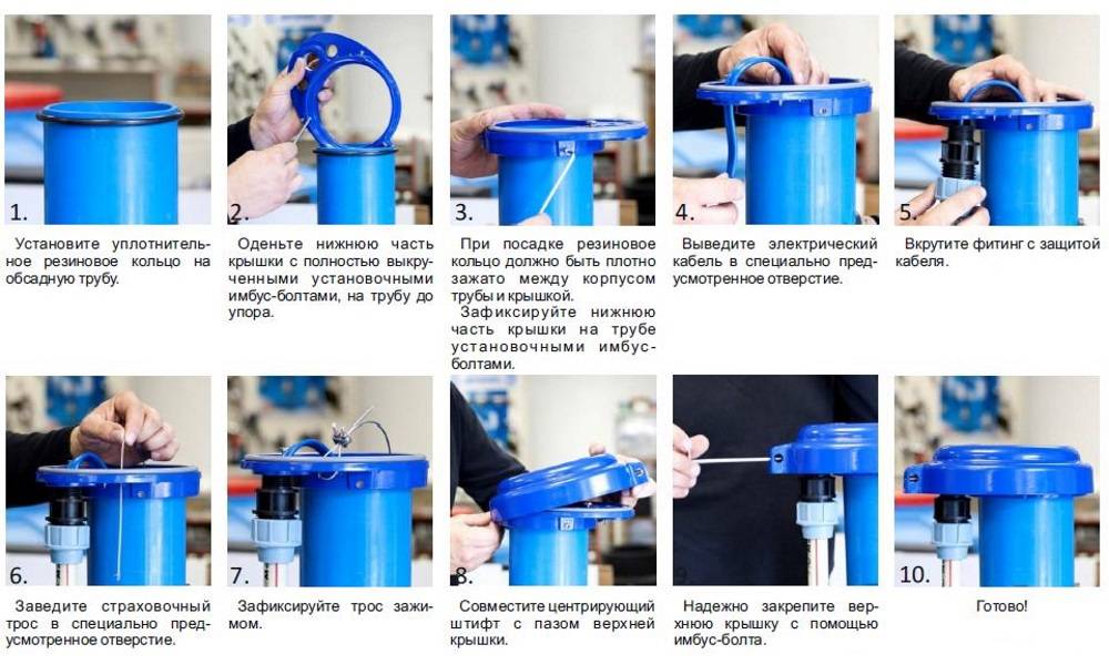 - К оборудованию насоса закрепляется пластиковая труба. До требуемой протяженности обсекается кабель, конец которого пропускается сквозь рым-болт, размещенный на внутренней поверхности крышки, стягивается хомутами и прикрепляется на карабин.