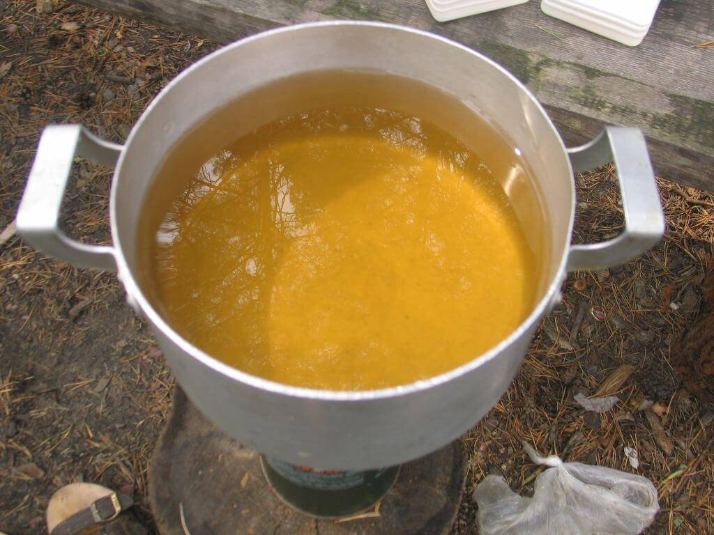 - Готовится состав: 200 граммами хлорной извести разбавляется литром воды, настаивается в течение часа. Сливается верхняя часть раствора, до осадка, а нижняя заливается, все перемешивается ведром и оставляется на сутки.